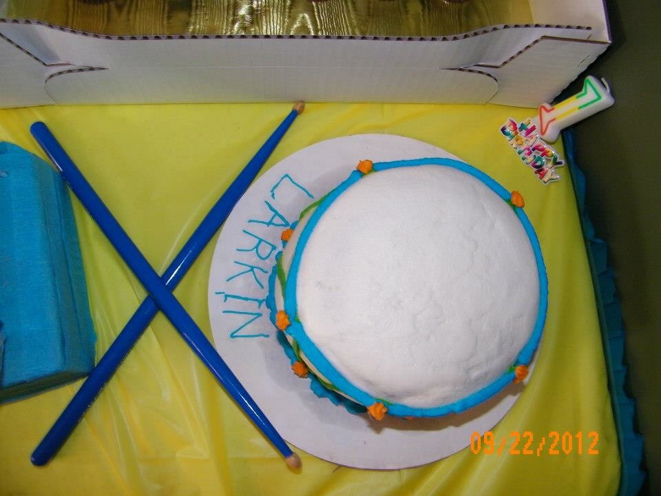 I had afamily member make a small cake into the appearance of a drum, accompanied by real drumsticks.