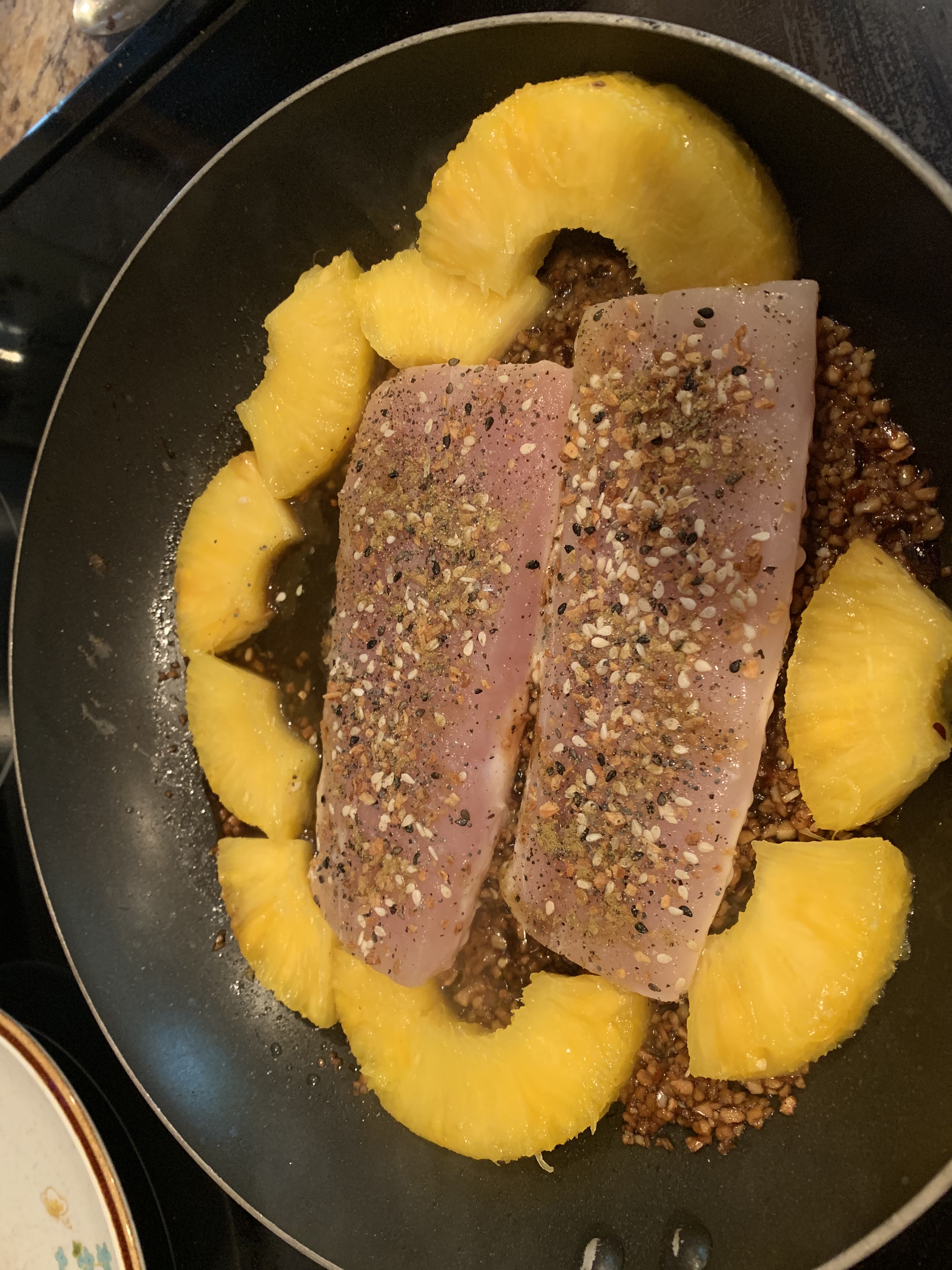 3. Oil the pan and coat Mahi-Mahi with soy sauce, small amount of soy sauce in pan for the pineapple and then season the fish. When flipped over with tongs soy again and add more seasoning (flip the pineapple too).