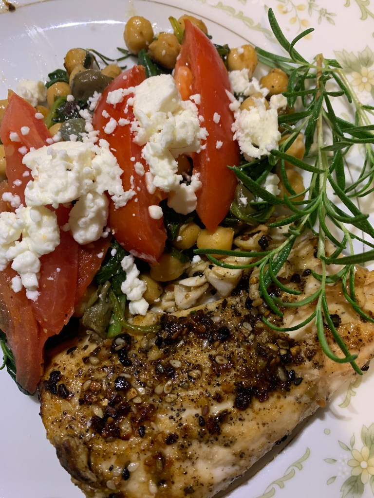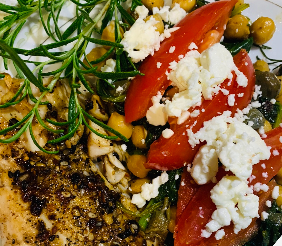 4. When done put chickpea mix on plate and top with blackened fish, roasted red peppers, and Feta cheese.