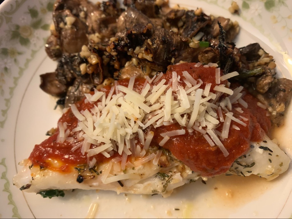 4. Put Mahi-Mahi on plate with cooked mushrooms to the side. Top Mahi-Mahi with red sauce and Parmesan cheese.