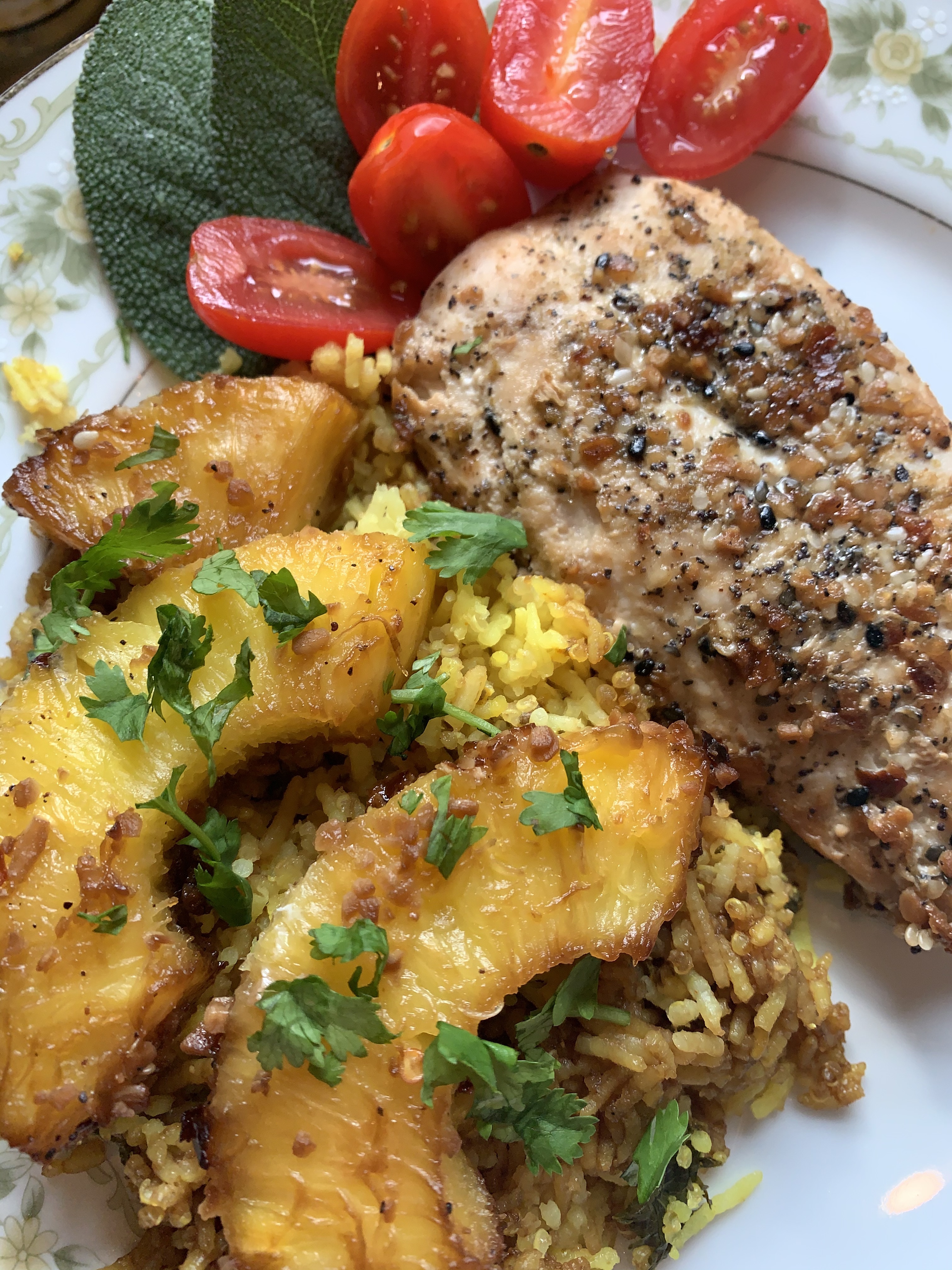 4. Serve steam rice with added soy as desired and add pineapple on top with fresh cilantro (if you please), and the fish.